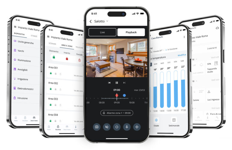 Direttamente da smartphone e in pochi passaggi è possibile controllare le funzioni di videoverifica, inserire e disinserire l’allarme di sicurezza, personalizzare i comandi domotici, regolare il clima degli ambienti, impostare scenari di sicurezza e domotica.